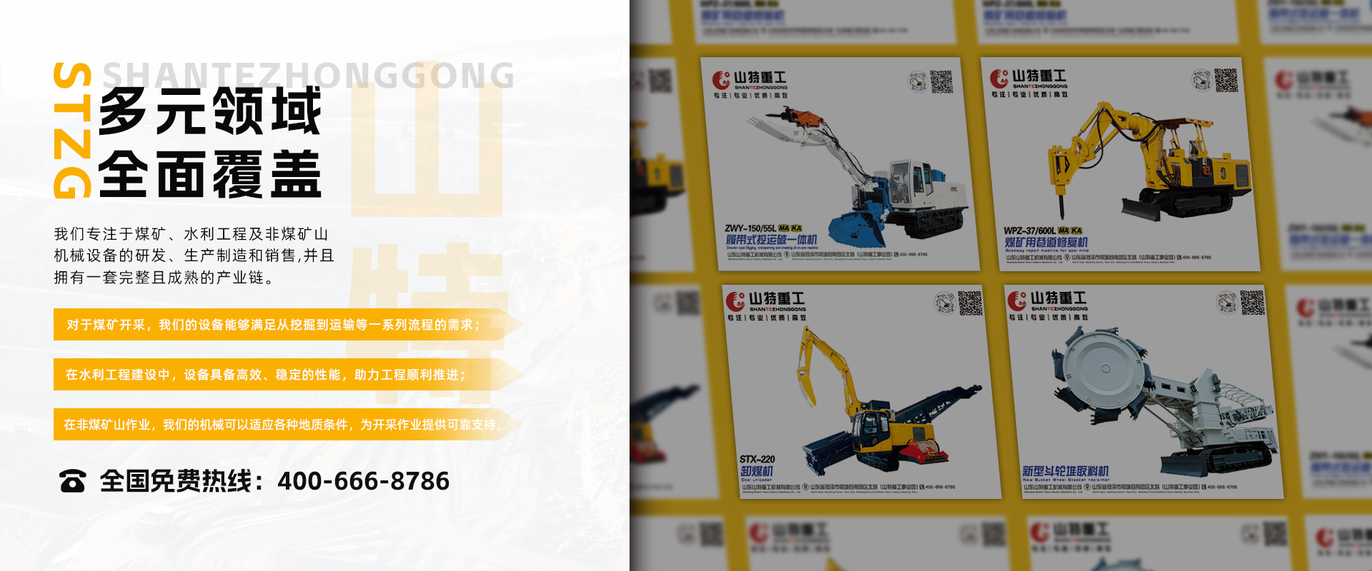 山東山特重工機(jī)械有限公司成立于2009年2月,是一家煤礦、水利工程及非煤礦山的機(jī)械設(shè)備研發(fā)、生產(chǎn)制造和銷售的自然人獨(dú)資企業(yè)。占地面積150余畝,產(chǎn)品主要有斗輪堆取料機(jī),扒渣機(jī),銑挖機(jī),巷道修復(fù)機(jī),電動(dòng)挖掘機(jī),卸煤機(jī),挖破運(yùn)一體裝載機(jī),翹毛臺(tái)車等,八大系列20余個(gè)品種,主要用于煤礦及非煤礦山、水利工程、鐵路修建及隧道、涵洞的開挖、火車港口貨物的裝卸、轉(zhuǎn)運(yùn)、堆碼等領(lǐng)域。國內(nèi)市場(chǎng)覆蓋28個(gè)省市自治區(qū)。